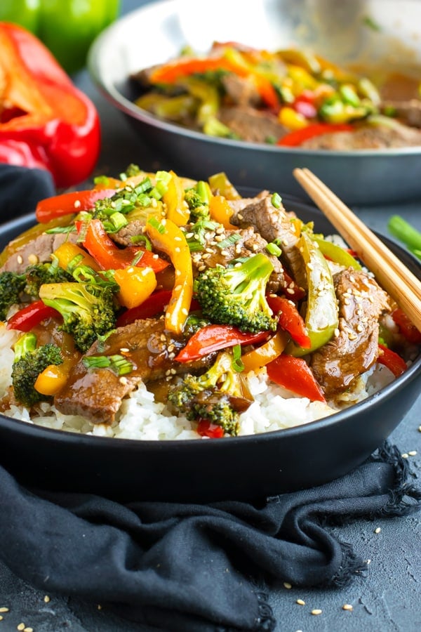 Return the cooked beef to the skillet and pour in the sauce mixture. Toss everything together and let the sauce thicken, about 2-3 minutes.